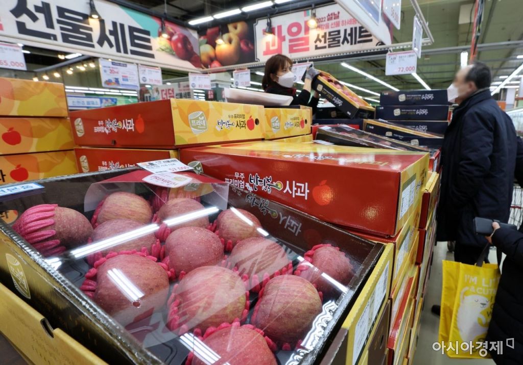 설 명절을 앞둔 20일 서울 서초구 농협하나로마트 양재점에서 시민들이 과일선물세트를 고르고 있다./김현민 기자 kimhyun81@