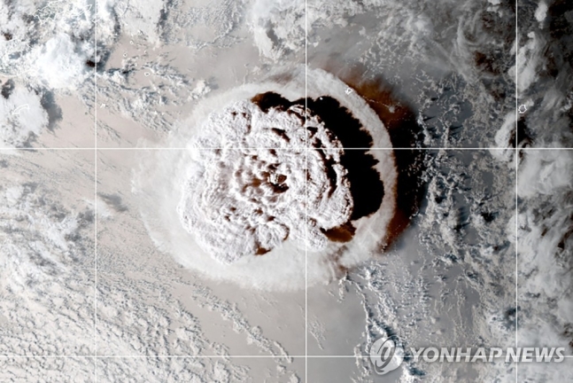 지난 15일 남태평양 섬나라 통가 인근 바다에서 해저 화산이 폭발하는 모습이 인공위성에서 포착됐다. [이미지출처=연합뉴스]