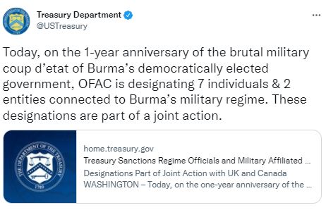 브라이언 넬슨 재무부 테러금융정보 담당 차관은 "쿠데타 1년 이후 미국은 영국, 캐나다 등 동맹국과 함께 자유와 민주주의를 추구하는 미얀마 국민들을 지지한다"며 "쿠데타와 계속되는 폭력에 책임 있는 사람들, 정권의 잔혹한 탄압을 조장하는 사람들, 그리고 그들을 재정적으로 지지하는 이들을 타깃으로 삼을 것"이라고 말했다.