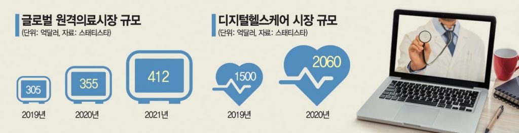 1일 업계에 따르면 원격의료 시장은 해마다 급증하는 추세다. 시장 조사 업체 포춘 비즈니스 인사이트에 따르면 전 세계 원격의료 시장 규모는 2019년 612억달러 규모에서 매년 평균 25.2%의 성장률을 기록해 2027년 5595억달러에 이를 것으로 전망했다. 특히 코로나19 확산은 보다 안전한 진료를 원하는 소비자들의 온라인 상담 수요와 원격 상담·모니터링 수요를 크게 증가시킨 것으로 분석된다. 한국무역협회 해외시장동향 분석 보고서를 보면 2020년 이후 영국, 미국, 독일, 일본 등 주요 국가들은 영상 진료 규제를 완화하고 개인정보 관련 규정을 개정해 원격의료 장벽을 낮추는 등 원격의료 활성화 지원에 나섰다.
