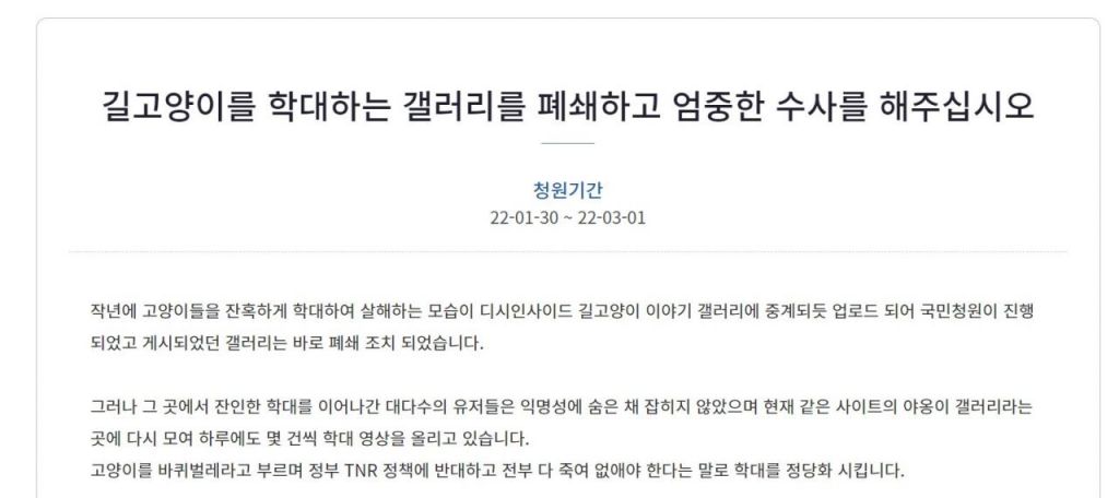 지난달 30일 청와대 국민청원 게시판에는 '길고양이를 학대하는 갤러리를 폐쇄하고 엄중한 수사를 해주십시오'라는 제목의 글이 게재됐다.
