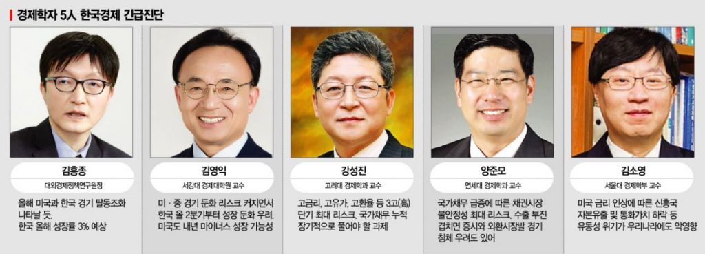 경제 전문가들은 미국과 유럽 등 각국의 공격적인 금리 인상으로 신흥국에서 자본 유출과 통화가치 하락 등 유동성 위기가 터지면 우리 경제에도 빠르게 전이될 수 있다는 데 인식을 함께 했다. 김소영 서울대 경제학부 교수는 "금리가 가장 큰 변수인데 미국 금리 인상에 따른 신흥국발 위기가 우리나라에 영향을 미칠 것"이라며 "한은의 금리 인상 횟수가 2~3번을 넘어가면 가계부채 등 취약 부문에서 예상하기 힘든 국면이 펼쳐질 수 있다"고 말했다. 이들은 대체적으로 올해 미국은 3회 이상, 한국은행은 2~3차례 금리를 올릴 것으로 봤다.