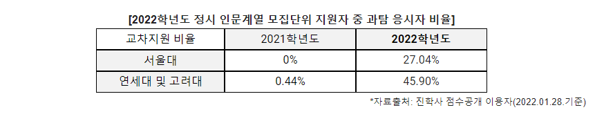 자연계열 수험생이 서울대 인문계열 모집단위에 지원한 경우가 드물었다는 점을 고려하면 이례적인 현상이다. 진학사의 점수공개 이용자 중에서도 서울대 인문계열에 지원한 자연계열 수험생 비율은 2021학년도 0%에서 지난해에 27.04%로 크게 증가했다. 연세대와 고려대(45.90%)에 비하면 낮지만 제2외국어·한문 응시 조건에도 불구하고 지원자가 크게 늘었다.