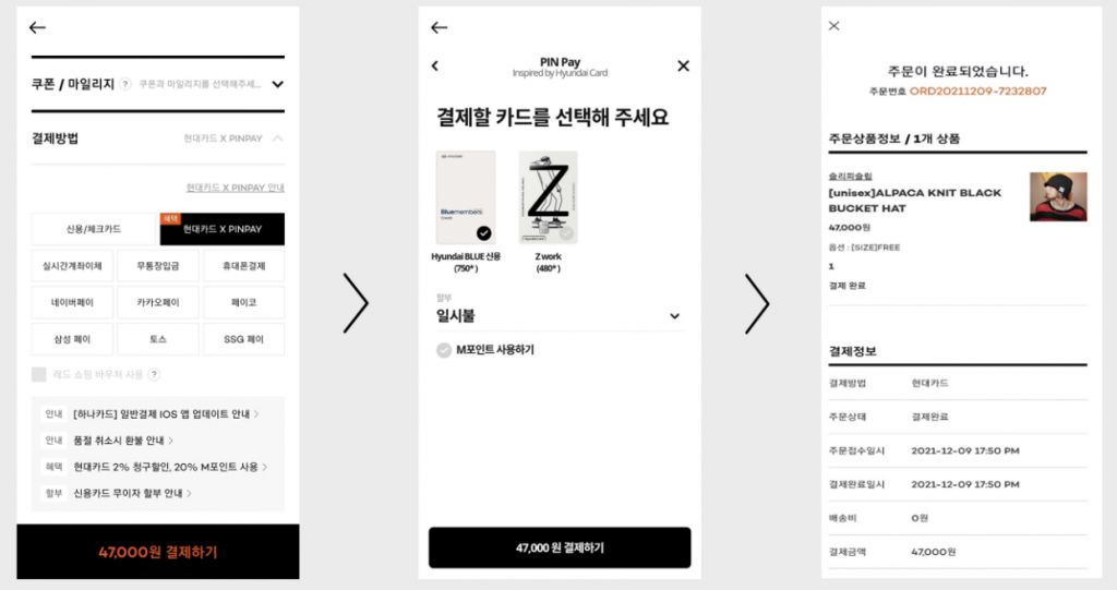 현대카드 핀페이가 먼저 적용된 곳은 온라인 편집숍 29CM다. 현대카드는 지난해 12월부터 29CM와 핀페이 시범서비스를 진행한 결과 30%에 달했던 결제 단계 고객 이탈률이 10%포인트 이상 개선되고 쇼핑몰 매출도 함께 늘어나는 등 전반적인 만족도가 높았다고 분석했다.