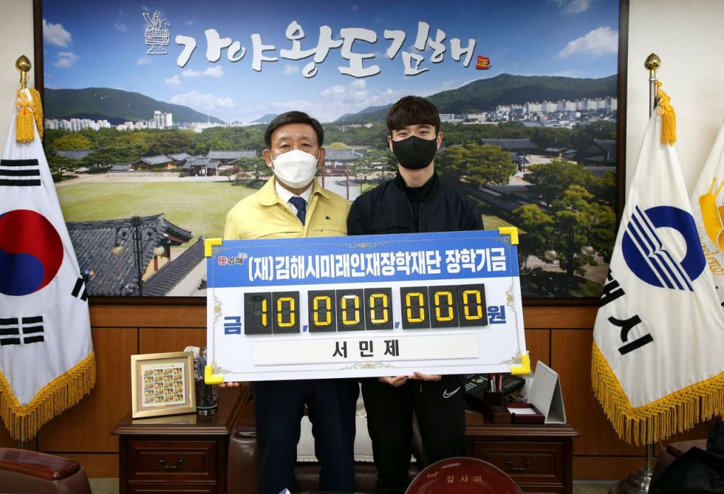 [아시아경제 영남취재본부 이세령 기자] 경남 김해시 복싱 유망주 서민제 선수가 김해시‘미래인재장학재단’에 1000만원의 장학금을 기탁했다.