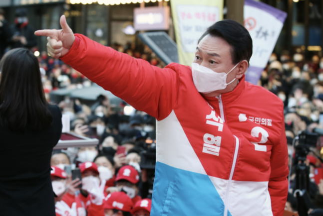 국민의힘 윤석열 대선 후보가 지난 15일 오후 부산 서면 젊음의거리에서 열린 거점 유세에서 지지를 호소하고 있다. /사진 = 연합뉴스