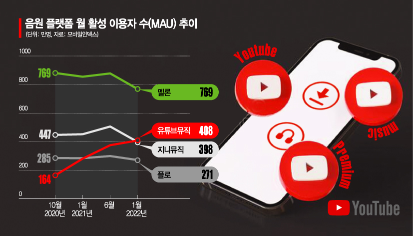 모바일 빅데이터 분석 업체 모바일인덱스에 따르면 1월 구글의 유튜브뮤직 활성 이용자 수(MAU)는 408만명으로 지니뮤직(398만명)을 제치고 국내 시장 2위로 올라섰다.