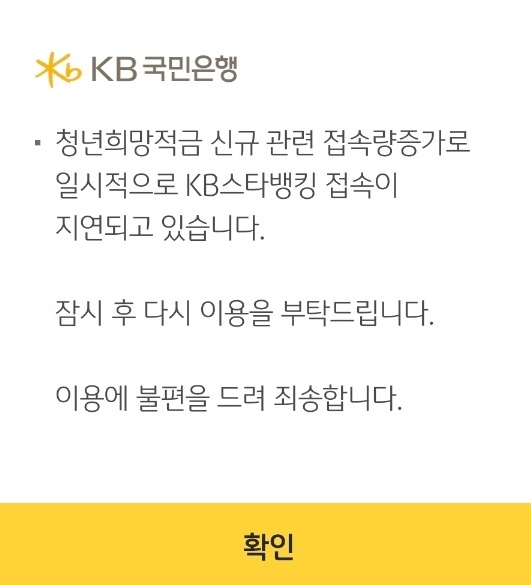 [아시아경제 송승섭 기자] 금융당국에서 출시한 청년희망적금이 가입 첫날부터 혼선을 빚고 있다. 은행당 수만명이 앱에 접속하면서 대기 시간이 1시간을 넘어갔다. 일부 은행 애플리케이션(앱)은 트래픽 접속량이 늘면서 일부 서비스 이용이 중단되는 현상도 빚어졌다.