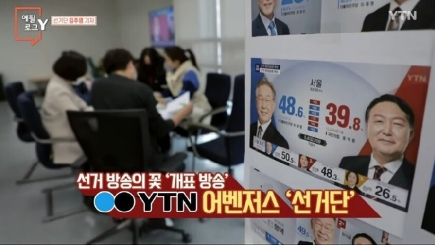 YTN은 지난 20일 공식 유튜브 채널에 올린 '에필로그 Y' 영상에서 미리보는 개표방송 과정을 소개했다. 이때 선거 방송의 꽃 '개표 방송' YTN 어벤저스 '선거단'이라는 자막과 함께 화면에는 이재명 50% 당선 확정 이미지가 표출됐다.