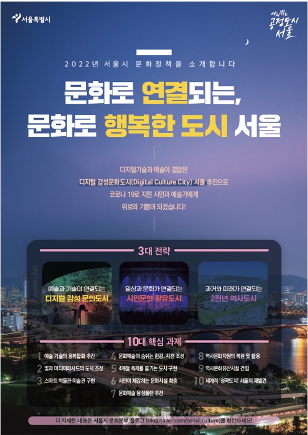 23일 서울시는 올해를 '디지털감성문화도시 서울'의 원년으로 선포하고 '문화로 연결되는, 문화로 행복한 도시 서울'이라는 비전 아래 올해 집중 추진될 3대 전략 10대 문화정책을 발표했다. 3대 전략에는 ▲디지털 감성문화도시 ▲시민문화 향유도시 ▲2천년 역사도시 등을, 10대 핵심 과제에는 ▲예술기술의 융복합화 추진 ▲빛과 미디어파사드의 도시 조성▲스마트 박물관 미술관 구현 ▲문화예술이 숨 쉬는 한강, 지천 조성 4계절 축제를 즐기는 도시 구현 등을 담았다.