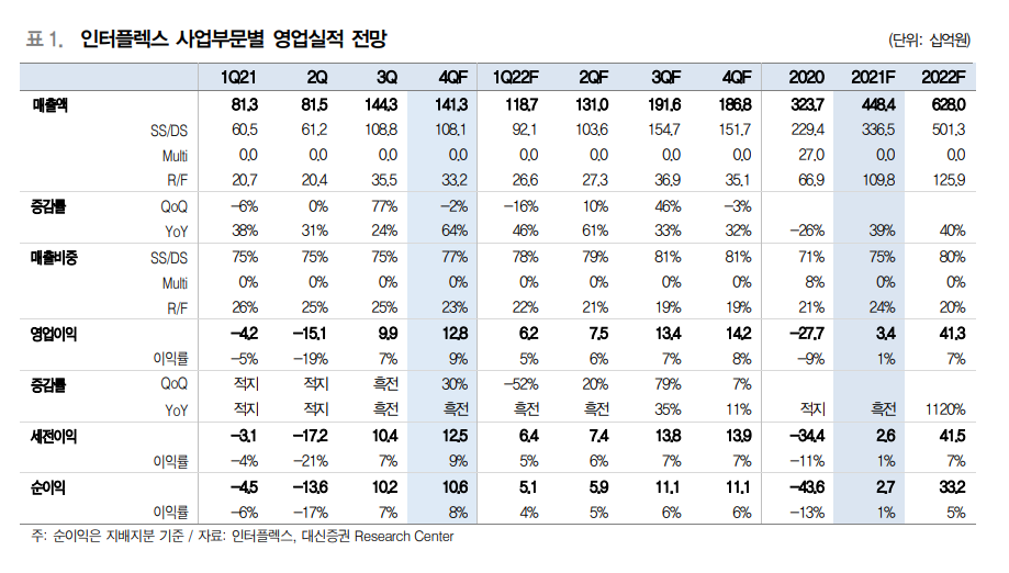 대신증권은 올해 인터플렉스의 매출액이 전년 대비 40.1% 상승한 6280억원, 영업이익은 1120% 오른 413억원으로 추정했다. 2023년 영업이익은 42% 상승한 584억원으로 예측했다.