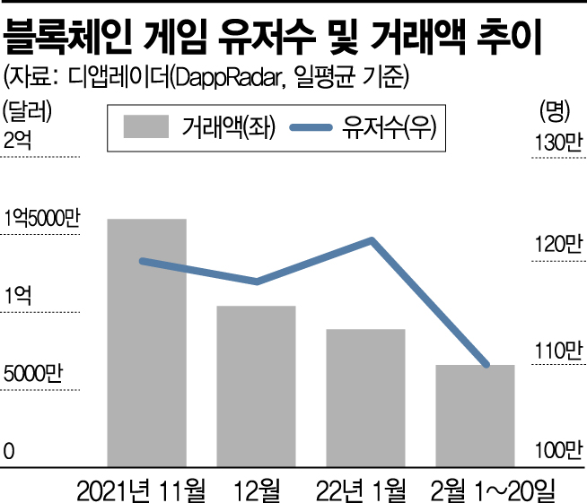 [아시아경제 이승진 기자] 국내 게임업체들이 앞다퉈 블록체인·NFT(대체불가토큰)을 활용한 ‘돈 버는 게임(P2E)’ 게임 시장에 진출하겠다고 나선 가운데 정작 블록체인 기반 게임들의 인기가 시들해지고 있다. 단순한 게임이 대부분인데다 암호화폐 가격이 최근 크게 하락한 영향으로 풀이된다.