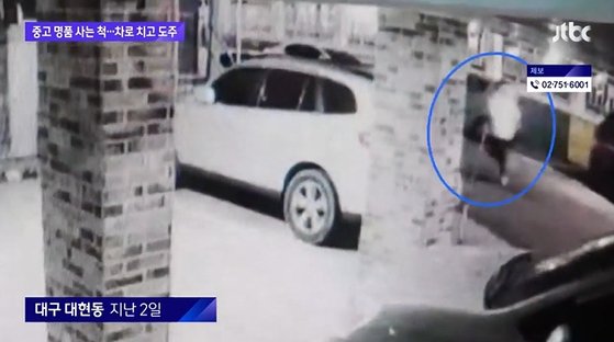 지난 2일 대구 대현동서 중고물품 거래 중 도주하는 차량을 뒤쫓는 남성의 모습 / 사진=JTBC 방송 캡처