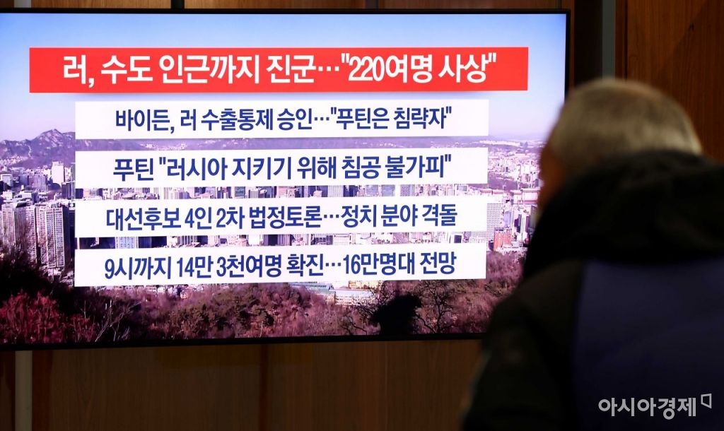 25일 서울역에서 시민들이 러시아의 우크라이나 침공 관련 뉴스를 보고 있다. /문호남 기자 munonam@