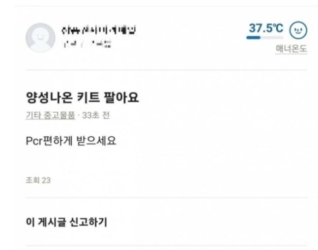[아시아경제 허미담 기자] 온라인 중고거래 사이트에 양성 결과가 나온 자가검사키트를 판매한다는 글이 게재돼 논란이 일고 있다. 문제의 글은 현재 삭제된 상태다.