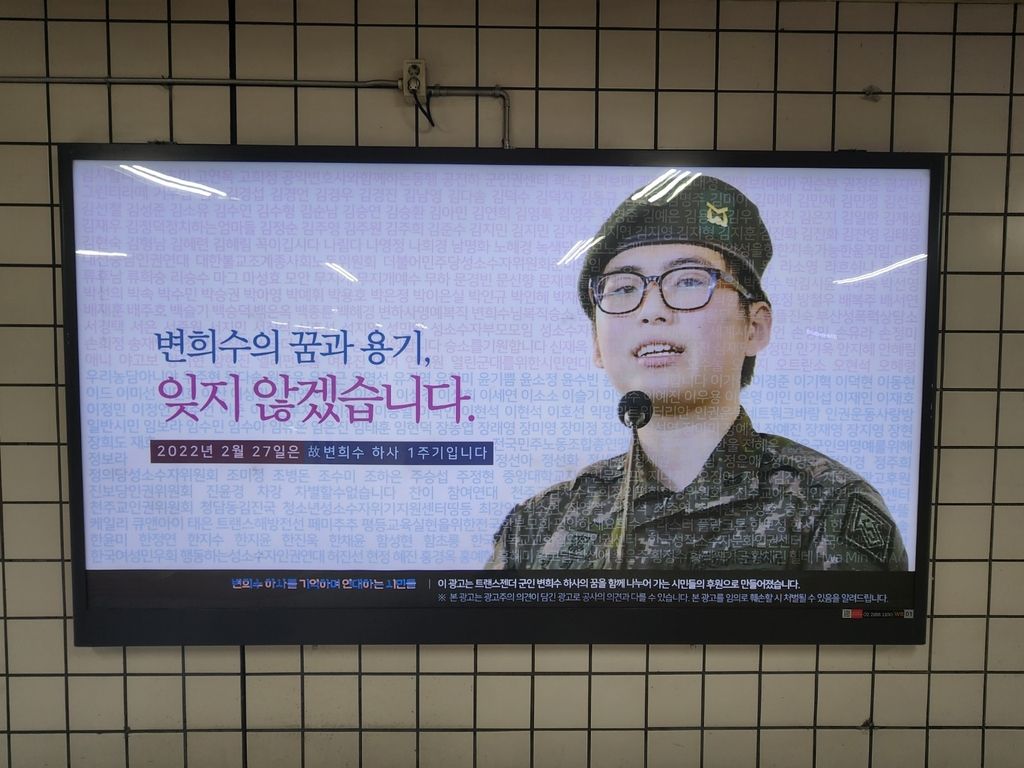 변 하사 추모 광고는 지난달 25일 이태원역 4번 출구 방면 벽면에 게재됐다. 화면 안에는 군복을 입은 변 하사의 얼굴과 함께 "변희수의 꿈과 용기, 잊지 않겠습니다", "2022년 2월27일은 故 변희수 하사 1주기입니다" 등 문구가 게재됐다.