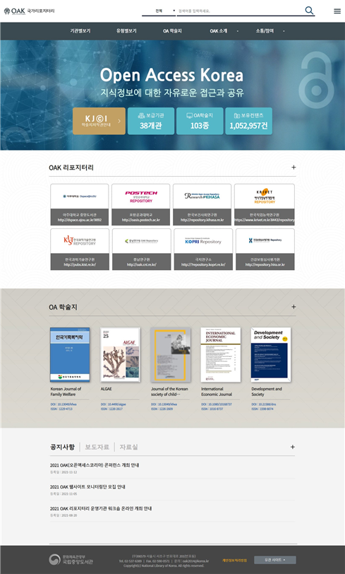 국립중앙도서관 관계자는 “이번 누리집 개편으로 다양한 분야의 연구성과들이 ‘OAK 국가리포지터리’를 통해 활발히 공유될 수 있기를 기대한다. 금년에도 OAK 리포지터리 운영정책 수립 가이드라인을 배포하고 오픈액세스 전환 학술지의 디지털화를 지원하는 등 국내 오픈액세스 학술연구자원의 공유 활성화를 위해 다양한 지원을 계속해 나갈 계획”이라고 밝혔다.