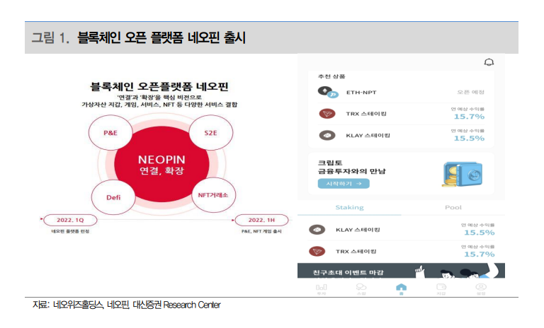 네오위즈 그룹은 네오핀, 메타라마라는 블록체인 플랫폼 2종을 올해 출시할 예정인데 이를 통해 블록체인 생태계를 구축할 방침이다. 네오핀은 네오위홀딩스의 자회사인 네오플라이가 출시, 올해 1분기 서비스를 시작한다. 네오핀은 금융 서비스과 함께 S2E(Service to Earn), P&E(Play and Earn) 컨텐츠를 추가 제공하는 블록체인 오픈 플랫폼이다. 네오핀에서 사용할 수 있는 가상화폐는 NPT로 지난달 28일 기준 글로벌 가상화폐거래소 2곳에 상장했고 일부 탈중앙화 금융(De-fi·디파이) 서비스도 오픈했다.
