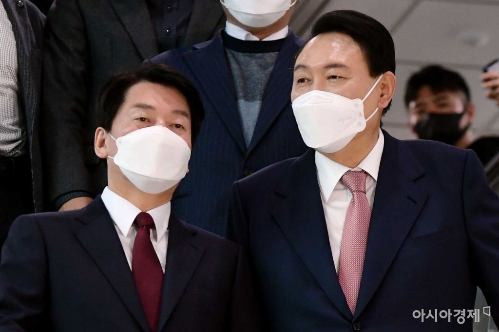 윤석열 국민의힘 대선 후보와 안철수 국민의당 대선 후보가 3일 오전 서울 여의도 국회 소통관에서 열린 단일화 및 합당 관련 공동 기자회견을 마치고 함께 이동하고 있다./국회사진기자단