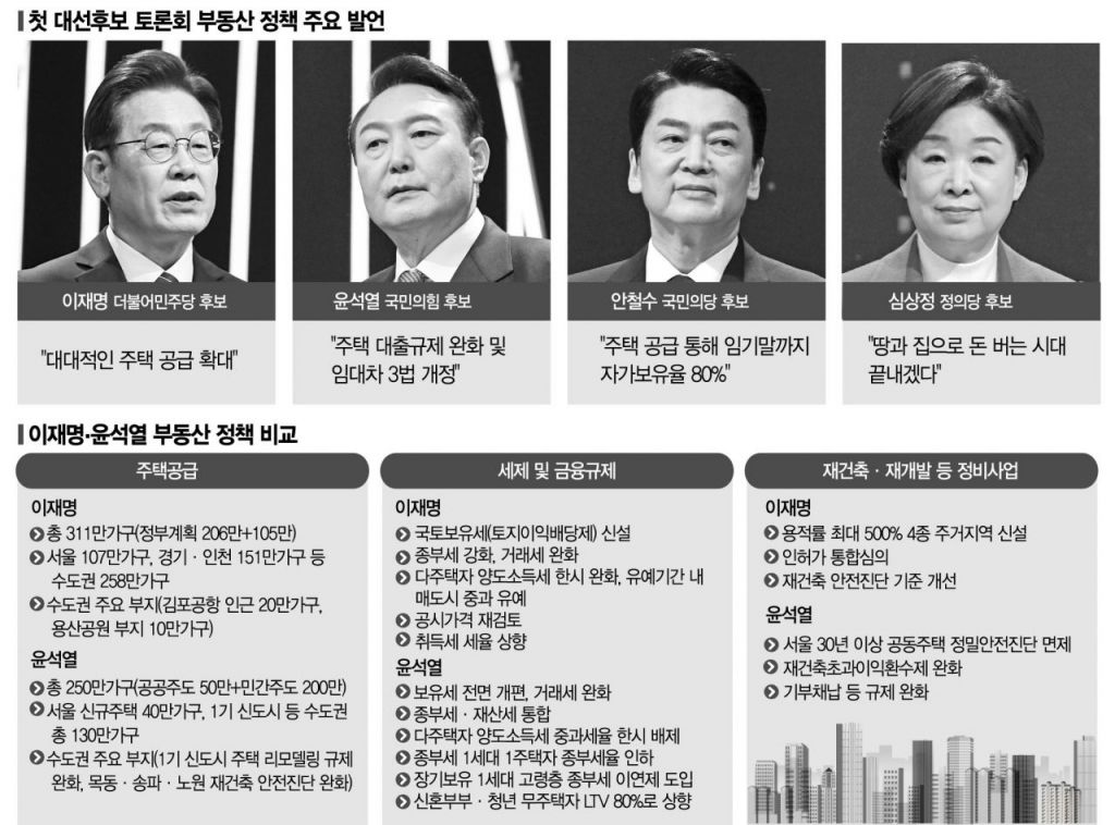 [아시아경제 이선애 기자] 대선이 하루 앞으로 다가오면서 업종별 수혜 찾기가 한창인 가운데 건설업은 누가 되더라도 호재를 만끽할 것으로 보인다. 그간의 여론조사 결과 유력한 당선자가 두 후보로 압축되는데, 이들이 제시한 부동산 관련 공약은 공통된 목소리를 내는 부분이 많다.