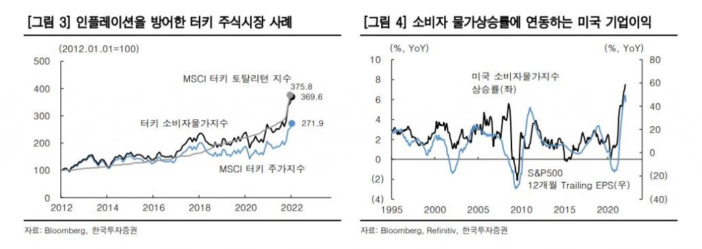 주목할 점은 주가이다. 터키의 주가지수는 동일 기간 동안 170% 넘게 상승했는데, 배당을 포함할 경우 270%넘게 상승했다. 주식이 인플레이션을 완벽히 헤지한 것으로 풀이된다. 정현철 한국투자증권 연구원은 "환율을 고려하면 이야기는 달라질 수 있지만 분명한 것은 자국 통화를 기준으로 주식투자는 인플레이션을 충분히 방어할 수 있는 훌륭한 수단이라는 점"이라며 "단기 변동성을 피하기 위해 시장을 떠나는 것보다는 자산 배분을 통해 변동성을 관리하면서 중장기 수익을 추구하는 전략이 필요한 상황"이라고 전했다.
