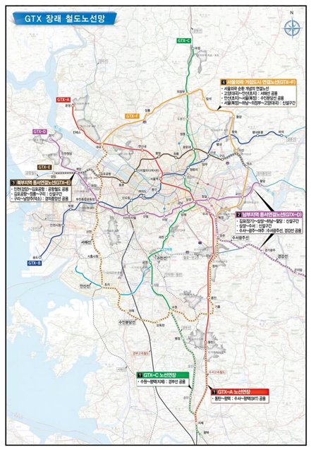 E 노선은 '인천~김포공항~정릉~구리~남양주'를 통과하도록 계획했고, F 노선은 '고양~안산~수원~용인~성남~하남~의정부~고양'으로 이어지는 순환선 형태다.