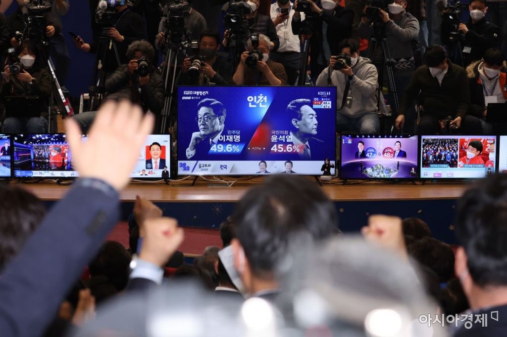 20대 대통령 선거일인 9일 국회 의원회관에 마련된 더불어민주당 개표 상황실에서 송영길 대표와 이낙연 총괄선대위원장 등 당 지도부가 출구조사 결과가 근소한 차이로 이기는것으로 나오자 환호하고 있다./윤동주 기자 doso7@