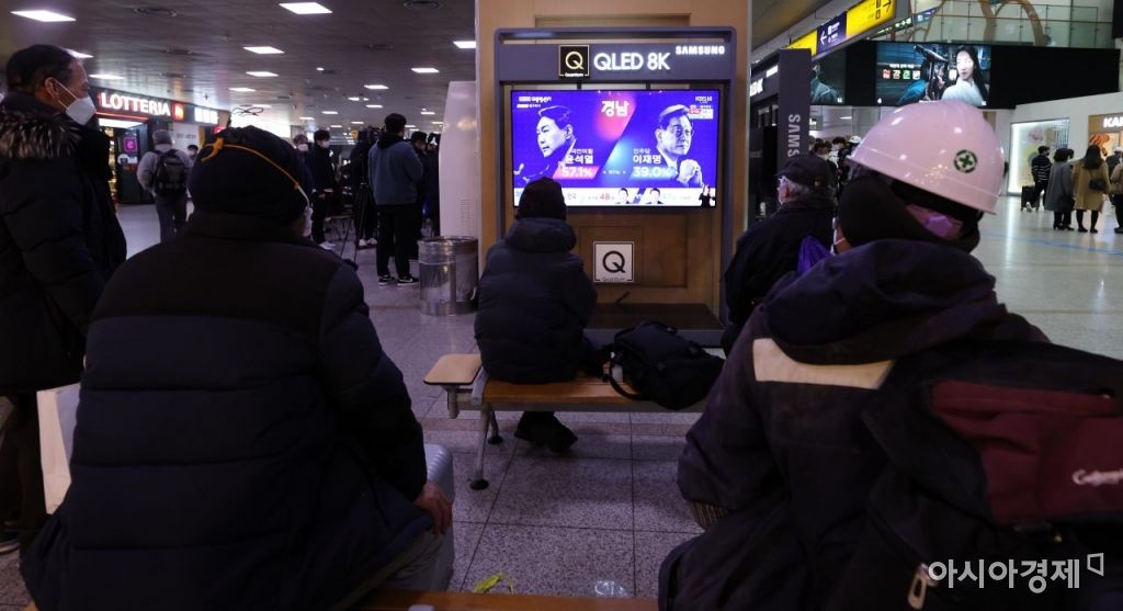 제20대 대통령선거일인 9일 서울역 대합실에서 시민들이 출구조사 결과를 지켜보고 있다./김현민 기자 kimhyun81@