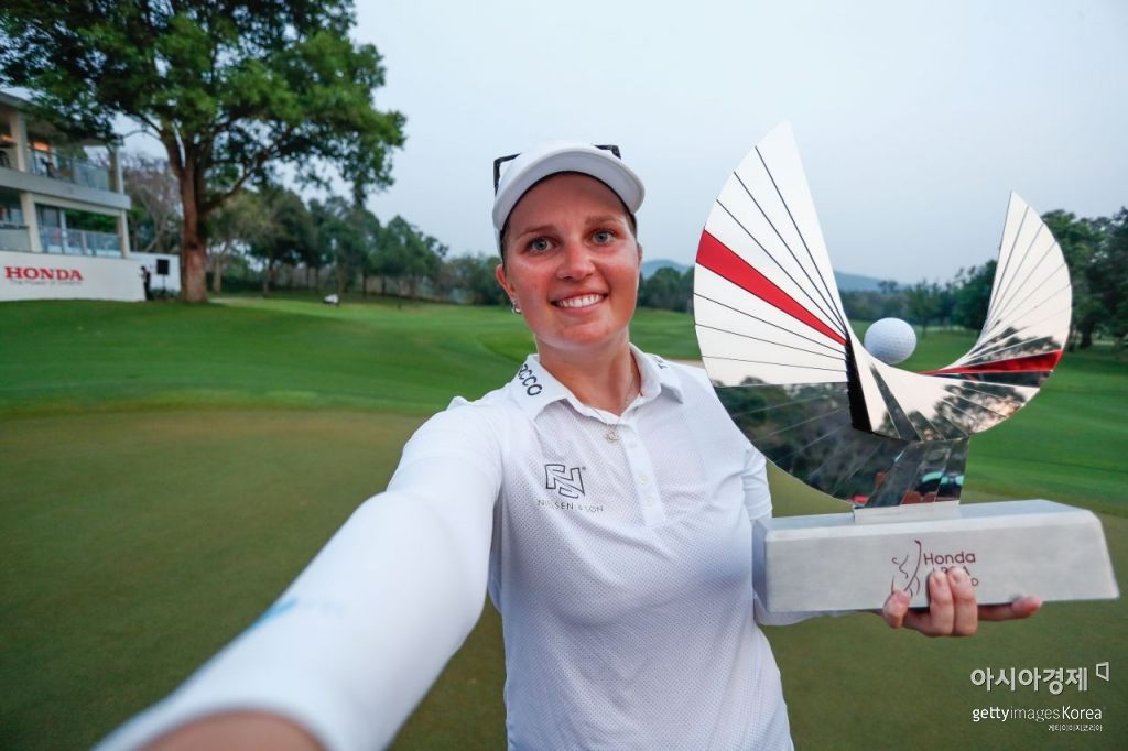 나나 쾨르스츠 마센이 혼다LPGA타일랜드 우승 직후 트로피를 들고 셀카를 찍고 있다. 파타야(태국)=Getty images/멀티비츠