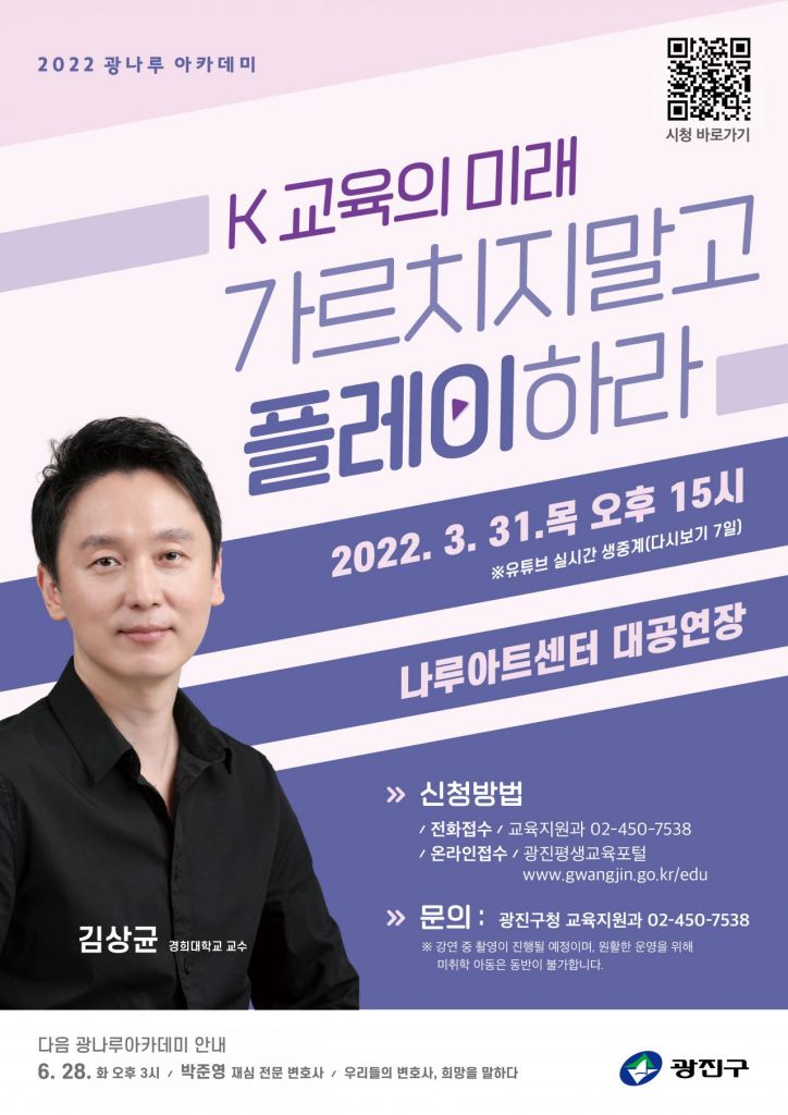 광진구 명사초청 특강인 광나루 아카데미는 김상균 교수와 함께 ‘K 교육의 미래, 가르치지 말고 플레이하라’를 주제로 나루아트센터 대공연장에서 2022년의 포문을 연다.