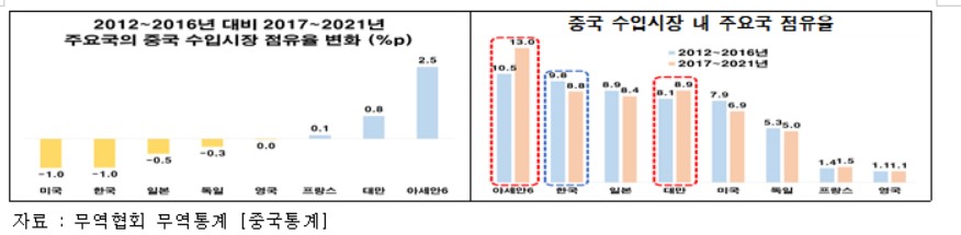 한국의 점유율은 2012~2016년 9.8%에서 2017~2021년 8.8%로 1.0%p 하락했다. 패권경쟁 중인 미국도 1.0%p 줄었다. 반면, 글로벌 공급망의 허브로 변모하고 있는 아세안 6개국과 대만의 점유율은 각각 2.5%p, 0.8%p 늘었다. 이 기간 대만의 중국 수입시장 점유율이 늘어난 것은 미국이 중국군에 활용될 수 있다는 이유 등으로 중국에 대한 반도체 기술과 장비 수출을 제한한 이후 중국의 대만산 반도체 수입이 증가했기 때문이다.