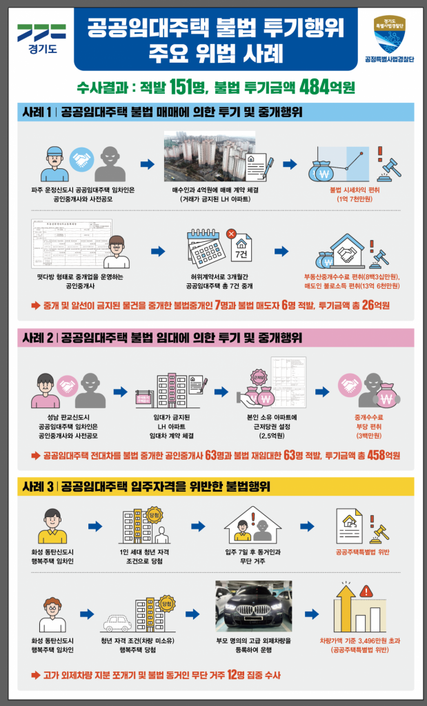 도 특사경은 이같은 수법으로 매매나 임대가 금지된 물건을 중개한 불법 중개인 70명과 불법 매매자 69명을 적발했다. 투기금액은 총 484억원이다. 현행 공공주택특별법과 공인중개사법에 따르면 공공임대주택을 불법으로 매매, 임대를 하거나 이를 중개할 경우 3년 이하의 징역 또는 3천만 원 이하의 벌금에 처해진다.