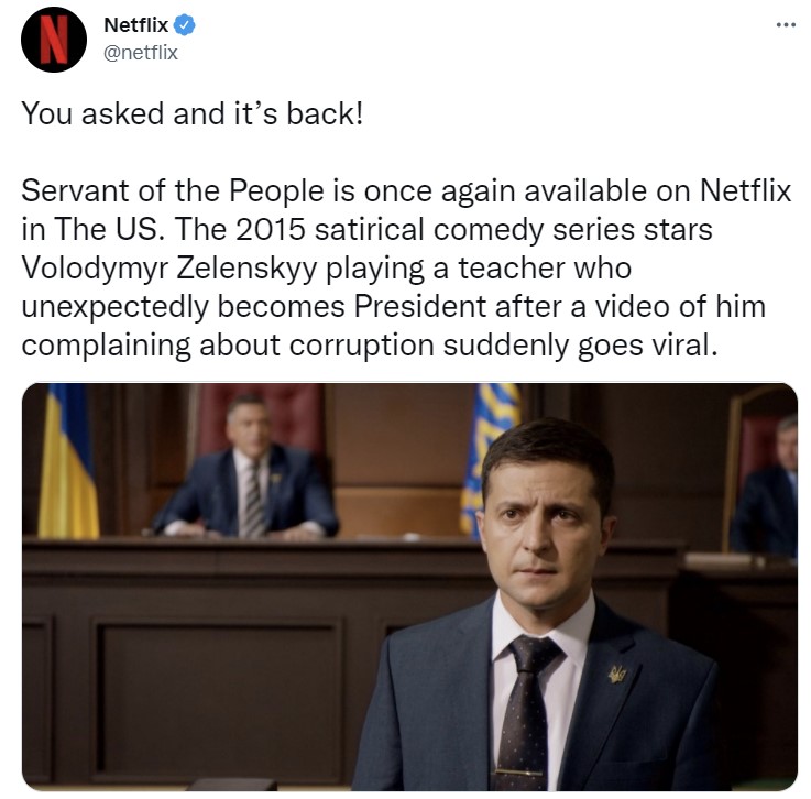 동영상 스트리밍업체 넷플릭스는 16일(현지시간) 자사 사회관계망(SNS)을 통해 "당신이 요청했고, 그것이 돌아왔다"면서 젤렌스키 대통령이 출연한 2015년 드라마 '국민의 종(servent of people)'을 다시 서비스한다고 밝혔다. 이 작품은 일종의 정치 풍자물로, 2017년에서 2021년까지 넷플릭스에서 방영됐었다. 23개 에피소드로 구성된 첫번째 시즌은 이날부터 미국 관객에게 영어자막과 함께 제공된다.