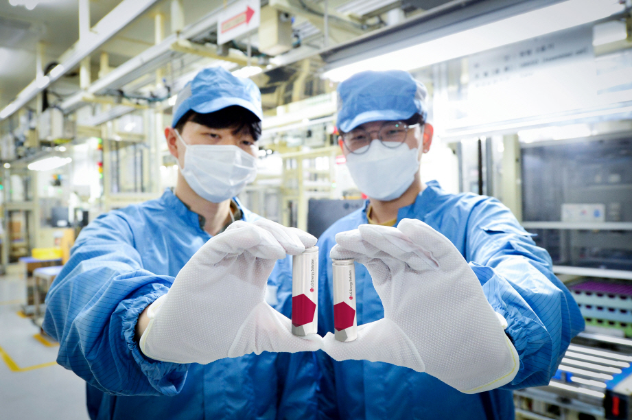 LG에너지솔루션 직원이 원통형 배터리를 선보이고 있다. [사진제공 = LG에너지솔루션]