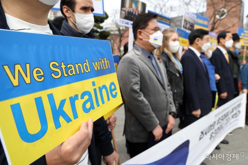 17일 서울 중구 주한 러시아대사관 인근 정동제일교회 앞에서 한국인권도시협의회 주최로 ‘러시아의 우크라이나 침공 규탄, 우크라이나 지지 기자회견’이 열리고 있다. /문호남 기자 munonam@