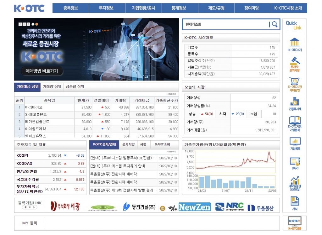 21일 금융투자협회에 따르면 국내 유일의 제도권 비상장주식 거래 시장으로 분류되는 'K-OTC'의 시가총액이 상반기 내 50조원을 엿볼 수 있을 것으로 보인다. K-OTC에는 등록되지 않았지만, 곧 상장예비심사청구서를 제출하는 컬리를 비롯해 비바리퍼블리카, 두나무 등 비상장기업에 대한 투자자들의 전반적인 관심이 높아진 데 따른 것이다. 이에 가장 안정적으로 거래할 수 있는 K-OTC 시장에 투자자들의 발길이 이어질 것으로 보인다.