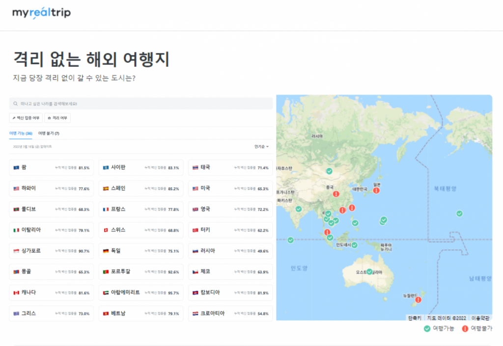 지난해 9월부터 마이리얼트립은 전 세계 주요 여행지의 코로나19 관련 정보를 제공하는 격리 없는 해외 여행지 검색 서비스를 운영 중에 있다. 매일 최신 여행지 정보를 업데이트해 고객들이 한눈에 알아볼 수 있도록 국가별 여행 조건과 준비 사항 등을 제공한다. 현재 여행 불가 지역인 일본, 홍콩 등은 알람 설정으로 실시간으로 정보 업데이트를 받을 수 있다.