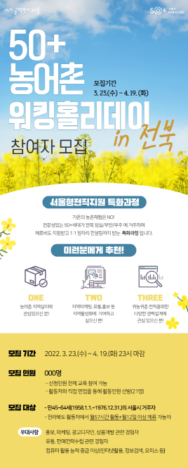 남경아 일자리사업본부장은 “50+세대는 귀농귀촌에 대한 관심도가 높다”며 “이번 ‘50+농어촌워킹홀리데이 in 전북’ 프로그램이 지역살이에 관심이 있는 서울시 50+세대에게 새로운 가능성의 기회를 제공할 뿐 아니라 50+인재와의 협업을 통해 지역경제도 활성화할 수 있는 도농상생의 장이 되길 바란다”고 말했다.