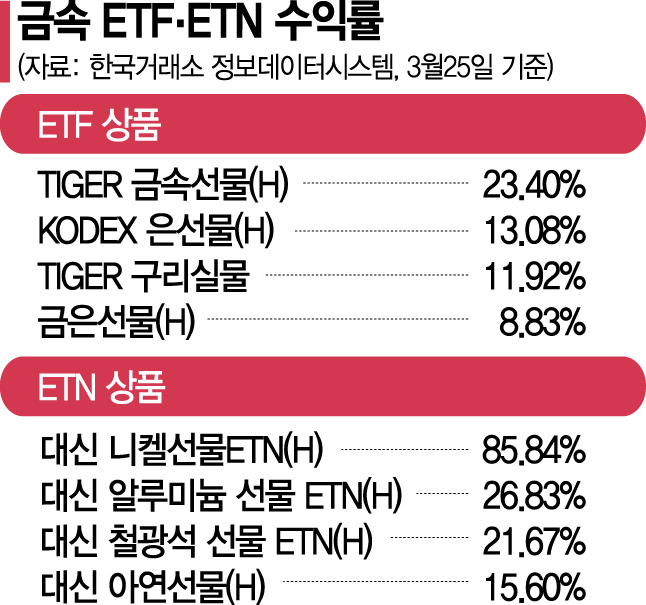 최근 3개월간 금속 ETF 수익률을 보면 △TIGER 금속선물(H) +23.40% △KODEX 은선물(H) +13.08% △TIGER 구리실물 +11.92%, 금은선물(H) +8.83%를 기록했다. 금속 ETN 수익률(레버리지 상품 제외)은 △대신 니켈선물ETN(H) +85.84% △대신 알루미늄 선물 ETN(H) +26.83% △대신 철광석 선물 ETN(H) +21.67% △대신 아연선물(H) +15.60% 순이었다.