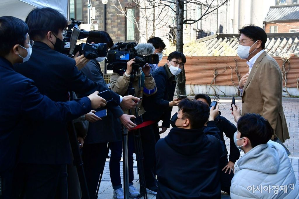 장제원 대통령 당선인 비서실장이 27일 오후 서울 종로구 통의동 인수위 사무실 앞에서 문재인 대통령과 윤석열 당선인과의 28일 예정된 만찬 회동과 관련 취재진의 질문을 받고 있다./인수위사진기자단