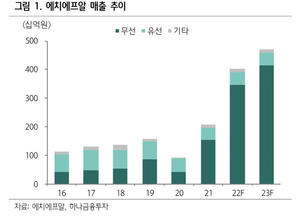버라이즌 수주 미확보 시에도 2022년 에치에프알의 영업이익은 415억원을 기록할 전망이다. 그러나 경쟁사의 CAPA 고려시 버라이즌 수주를 확보하지 못할 가능성은 낮으며 총 수주 물량의 50% 이하를 확보한다고 가정해도 수출액은 전년대비 172% 성장한 2962억원을 기록할 것으로 추정된다. 김 연구원은 "통신장비 업체들의 실적부진이 지속되며 장비주에 대한 투자심리가 위축되었지만 실적을 통해 북미향 투자 사이클이 돌아왔음을 증명중인 에치에프알에 대해 관심환기가 필요한 시점이라 판단된다"고 강조했다.