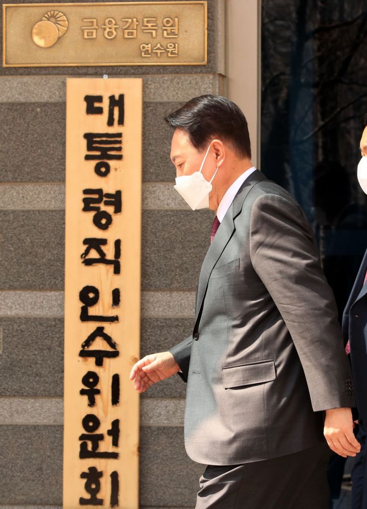 윤석열 대통령 당선인이 29일 서울 종로구 통의동 금감원 연수원에 마련된 제20대 대통령직인수위원회 집무실에서 외부 일정 참석차 나서고 있다. [이미지출처=연합뉴스]