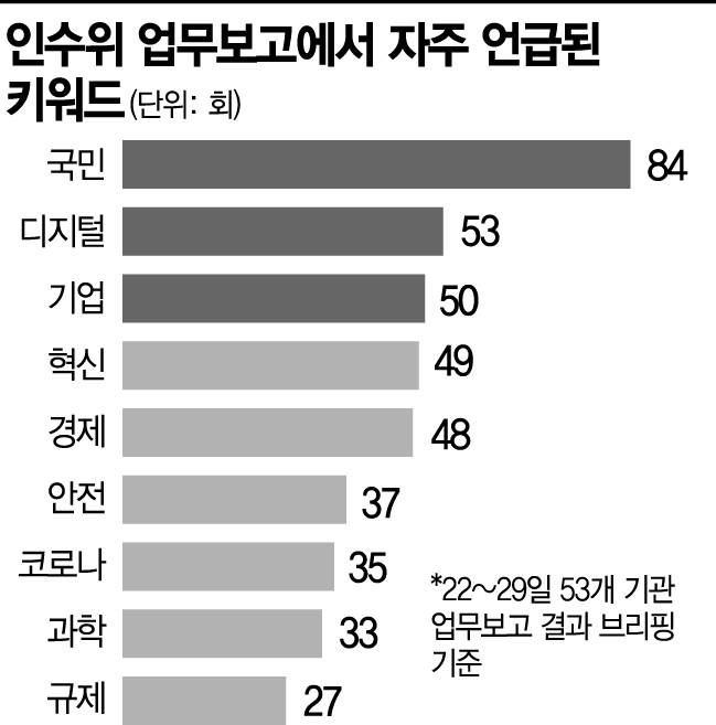 아시아경제가 지난 22~29일 53개 기관을 대상으로 진행된 인수위의 업무보고 브리핑을 분석한 결과, 가장 많이 언급된 단어는 ‘국민’으로 총 84회였다. 국민이라는 단어는 참여, 체감, 부담 최소화라는 단어와 어울려 자주 사용됐다. 정책을 구체화하는 과정에서 국민들을 의식하고 있다는 의미로 풀이된다. 윤석열 대통령 당선인은 전날 간사단 회의에서 "실용주의와 국민이익을 국정과제의 기초로 삼아달라"고 주문했다.