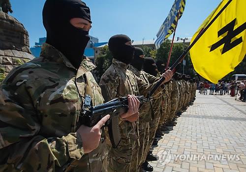 아조우 연대의 신병들. 지난 2015년 연대 측 대변인은 신병 중 10~20%가 나치 추종자라고 주장해 논란이 불거졌다. / 사진=연합뉴스
