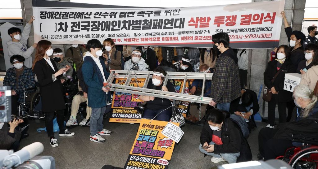 30일 오전 서울 지하철 3호선 경복궁역 탑승장에서 열린 전국장애인차별철폐연대의 장애인권리예산 및 관련법 개정 요구에 대한 인수위 답변 촉구 삭발 투쟁 결의식 / 사진=연합뉴스