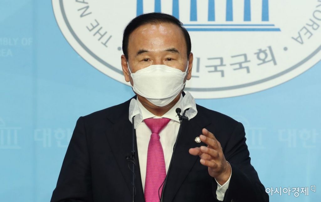 박덕흠 국민의힘 의원이 21일 국회에서 피감기관 공사 수주 특혜 의혹 해명 기자회견을 갖고 있다. 박 의원은 지난 2012년부터 국회 국토교통위원회 소속 당시 가족 명의 건설회사 5곳을 통해 피감기관 발주 공사 수천억원대를 수주했다는 의혹을 받고 있다. 특히 2015년 서울시 국정감사에서는 가족 회사에 유리한 공법을 채택하도록 서울시에 직접 요구하기도 했다./윤동주 기자 doso7@