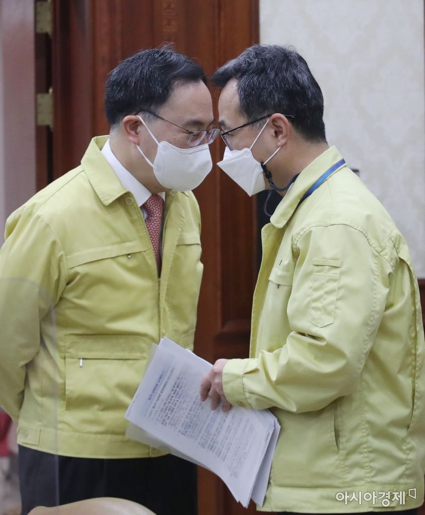 문승욱 산업통상자원부 장관과 박원주 청와대 경제수석이 31일 서울 종로구 정부서울청사에서 열린 비상경제 중앙대책본부 회의에서 대화를 하고 있다./김현민 기자 kimhyun81@