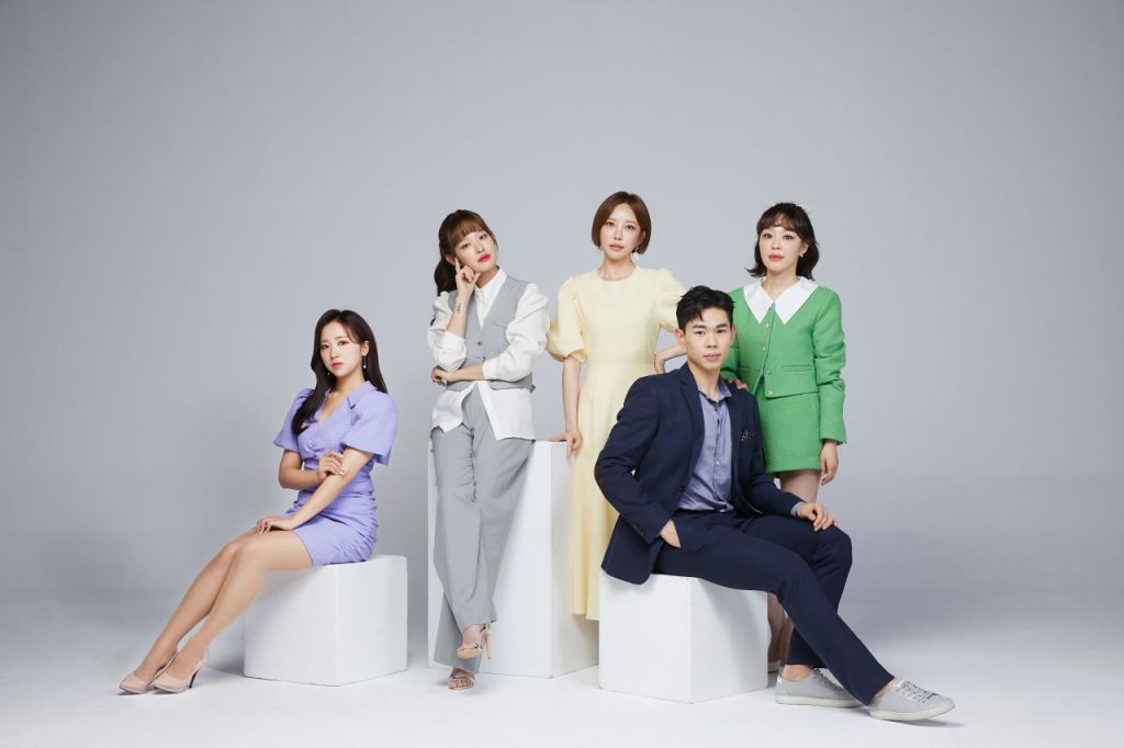 카카오쇼핑 라이브 전속진행자들이 단체 사진을 촬영하고 있다. 왼쪽부터 배혜지, 이시아, 담쓰, 김주승, 오민화.