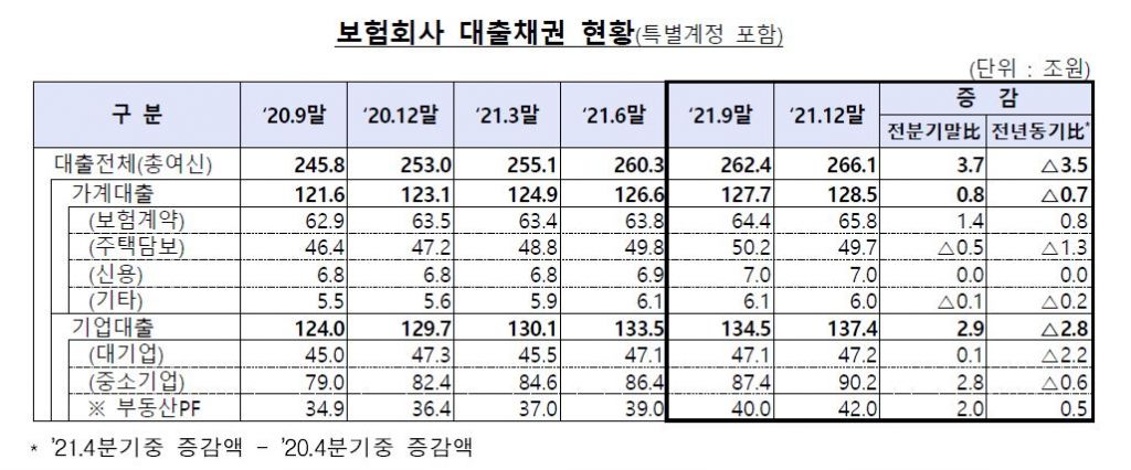금융감독원은 지난해 12월 말 기준 보험회사들의 대출채권 잔액이 266조1000억원으로 전분기 대비 3조7000억원 증가했다고 6일 밝혔다.