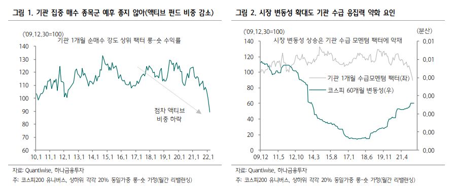 이경수 하나금융투자 연구원은 "향후에도 기관 수급 모멘텀 팩터의 성과 회복을 기대하기는 어려워 보인다"며 "펀더멘털상 이머징보다는 선진국에 가까운 한국은 액티브 펀드가 늘어나기 어려운 환경이다. 오히려 높아진 패시브 펀드와 사모 펀드의 비중으로 자칫 특정 종목에 대한 기관의 지분 신고 등을 역이용하는 전략이 나타날 수 있다"고 전했다.